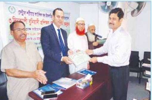 প্রগতি লাইফ ইন্স্যুরেন্স লিমিটেড এর এসিস্ট্যান্ট জেনারেল ম্যানেজার মোহাম্মদ আবদুল্লাহ চৌধুরীকেসনদপত্র প্রদান করছেন কাউন্সিলের সেক্রেটারী জেনারেল অধ্যাপক মাওঃ এবিএম মাছুম বিল্লাহ